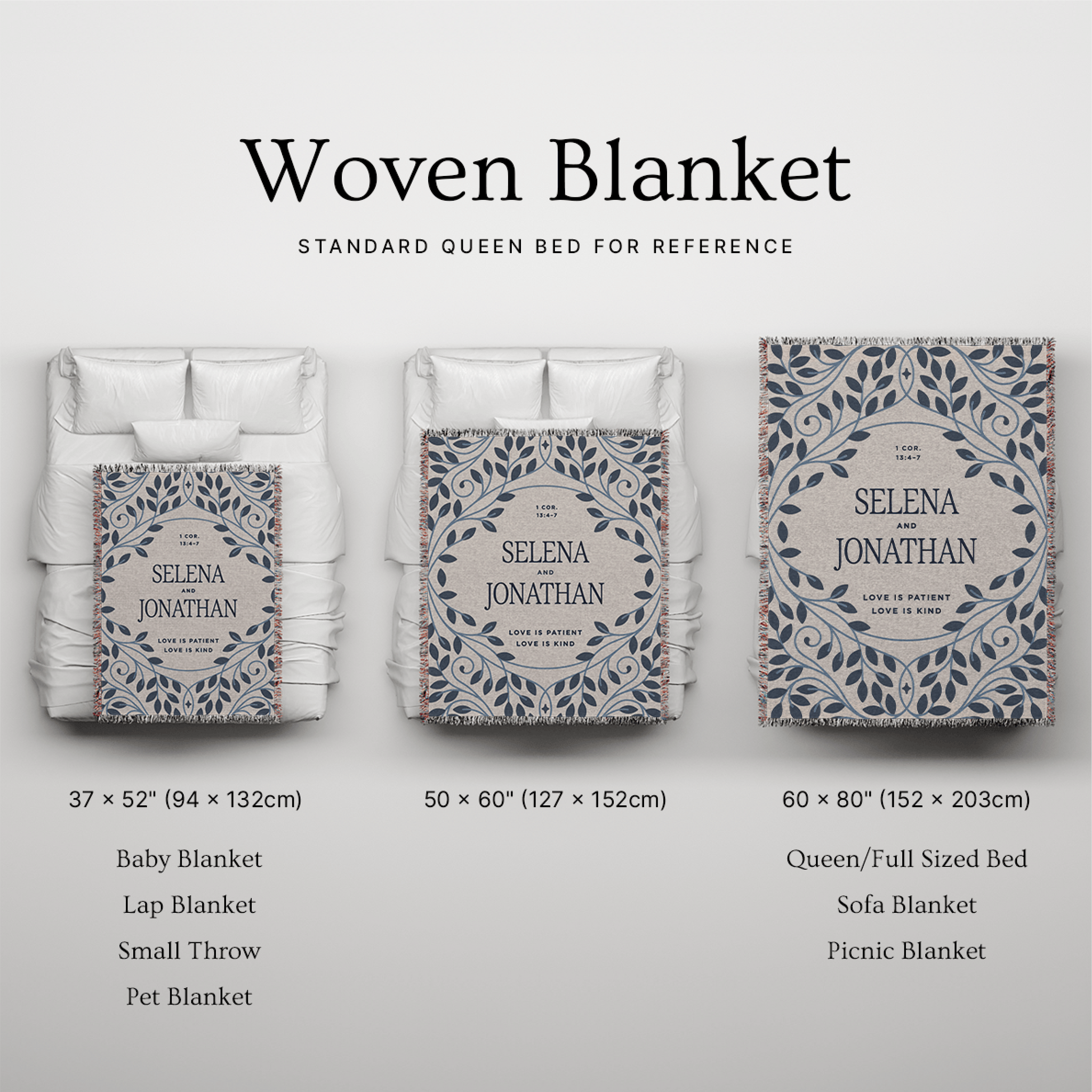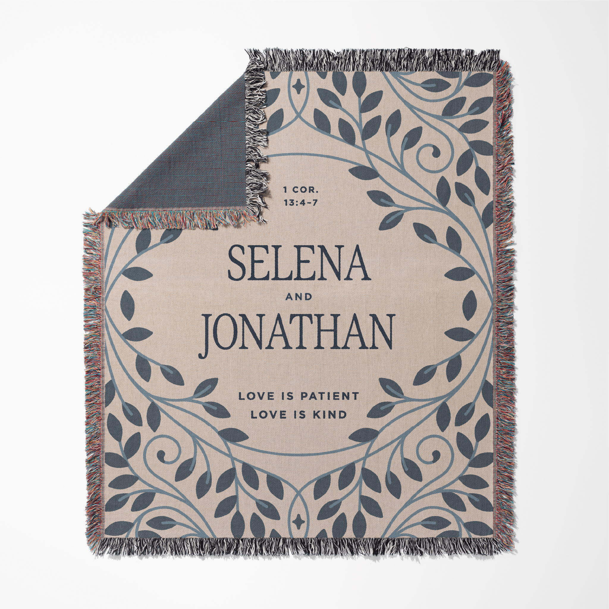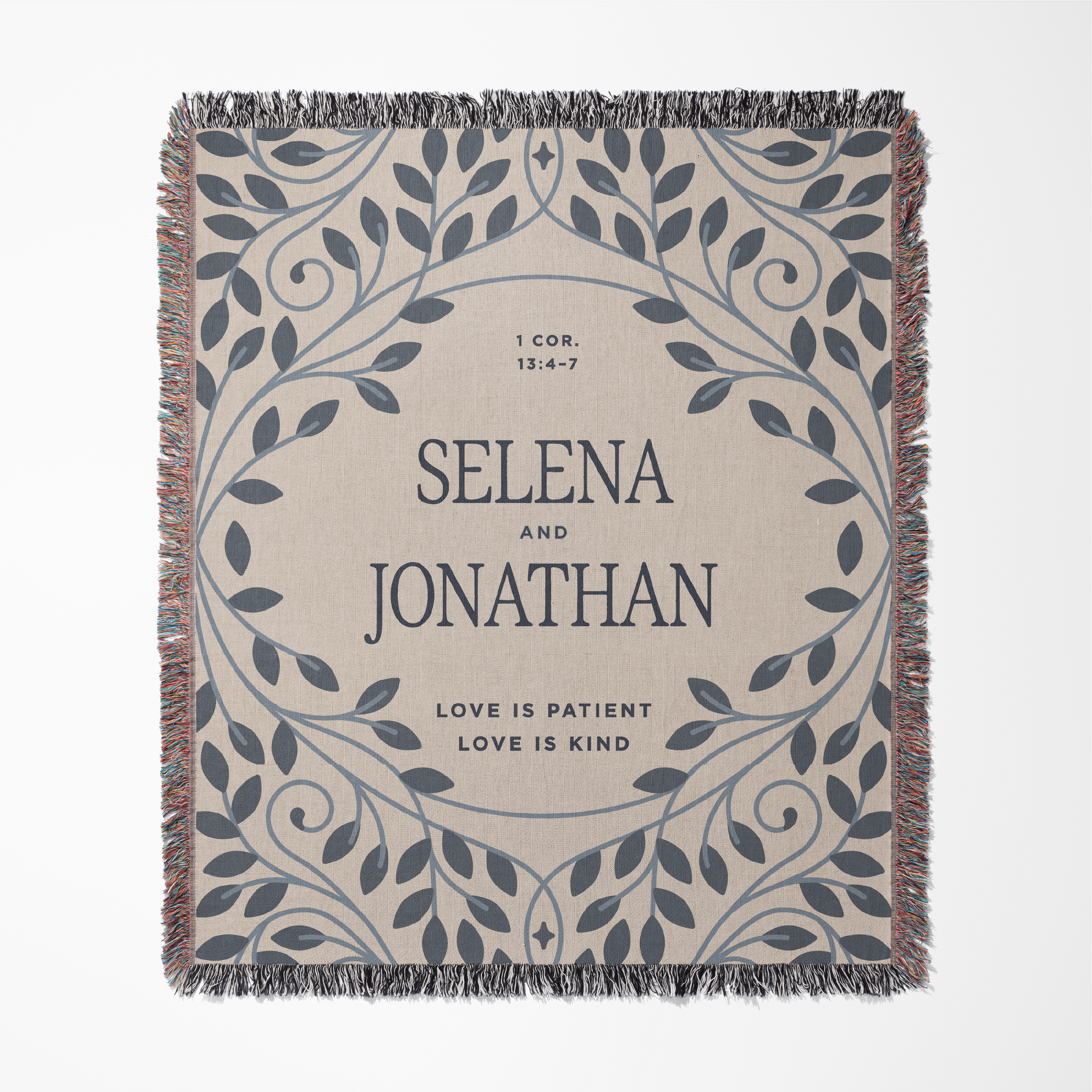 Framed by an elegant, vine-inspired border in soft blue tones, this blanket carries a refined, heirloom feel—designed to complement a home while quietly speaking something deeper. At the center, the couple’s names are beautifully displayed, making each piece uniquely theirs—a lasting reminder of their shared story and commitment.