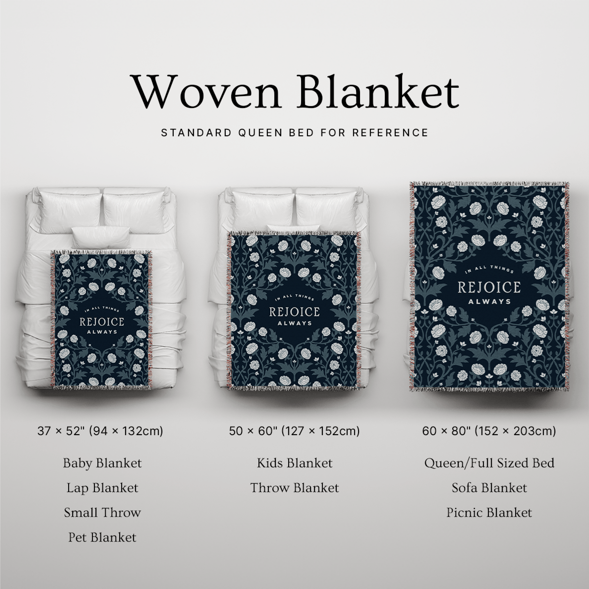 Rooted in the timeless encouragement to rejoice in every season, the Rejoice Always Christian woven blanket brings warmth, faith, and quiet joy into your home. Designed as meaningful Christian home decor, this Scripture-inspired piece reflects a heart anchored in gratitude — even through life’s changing moments.