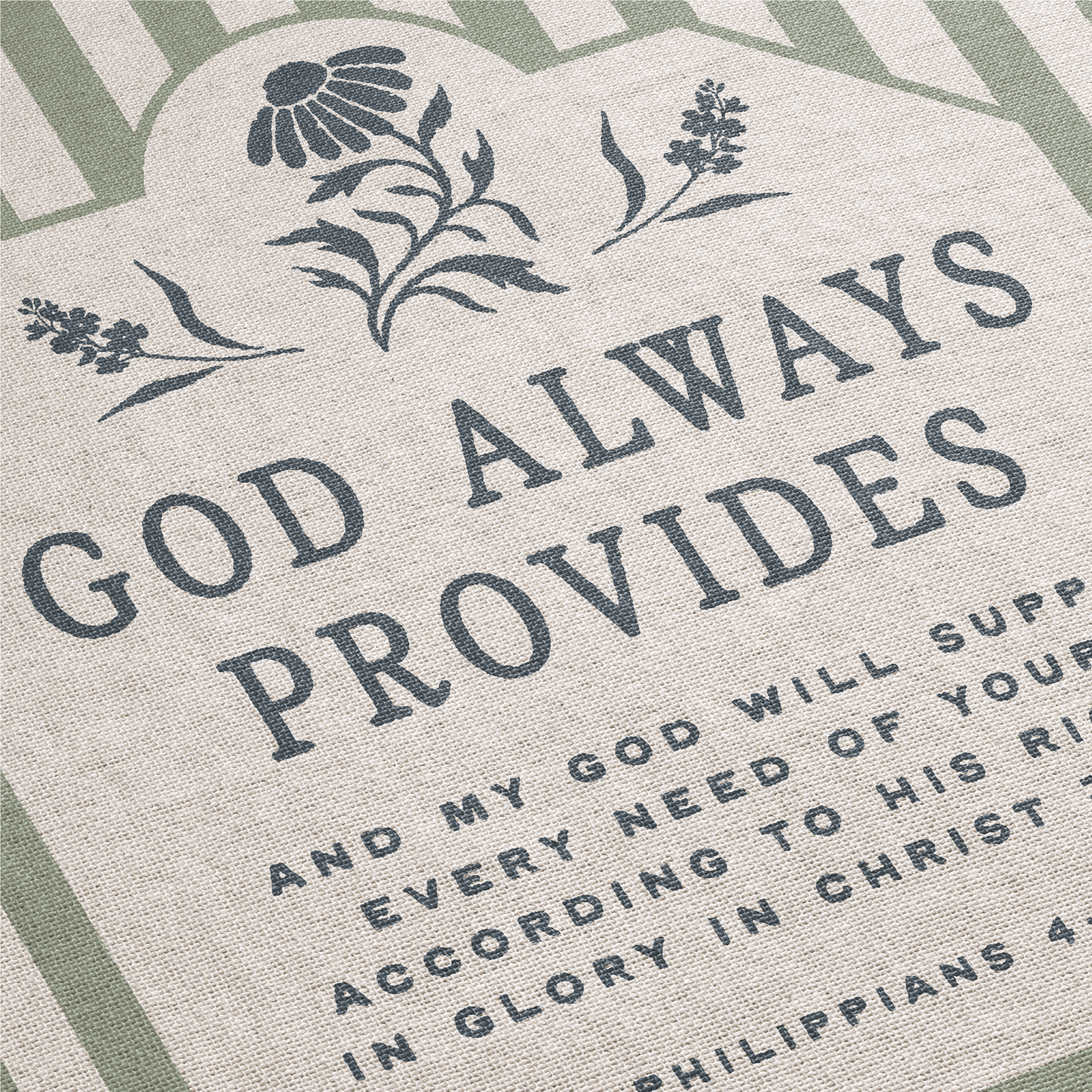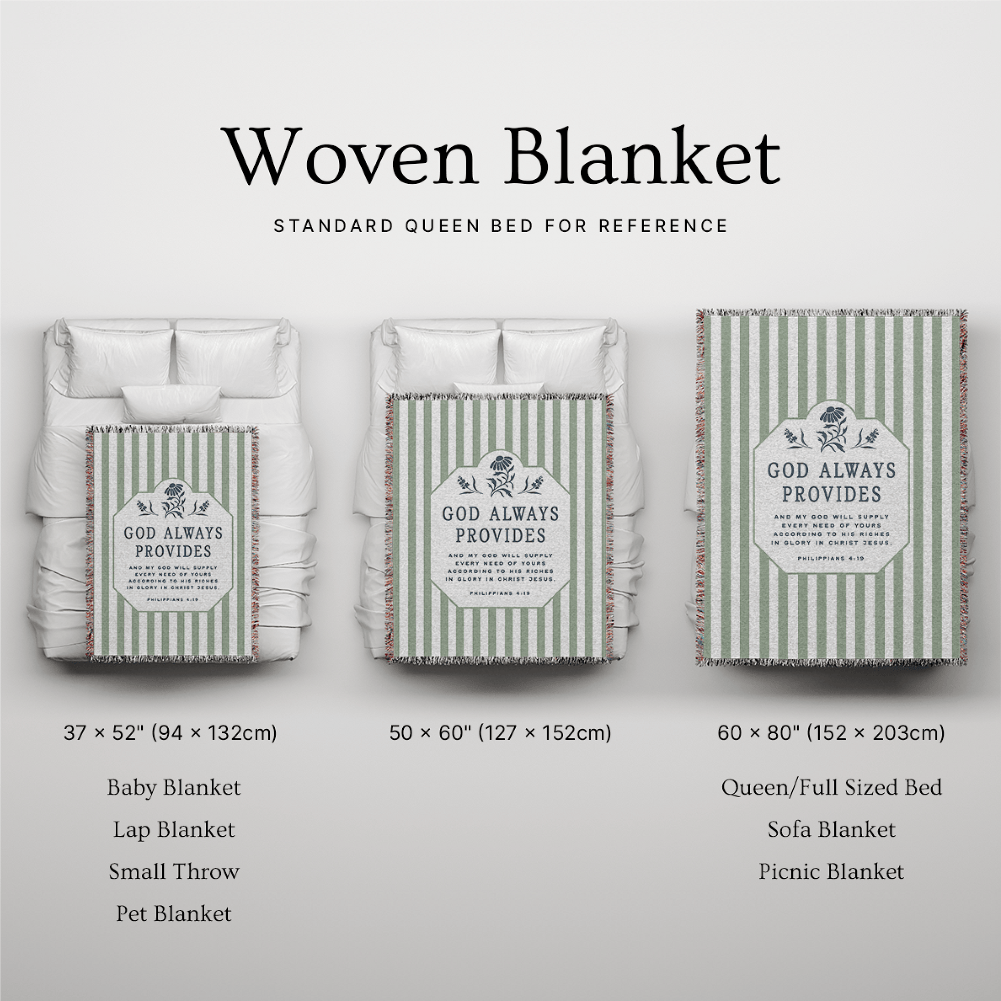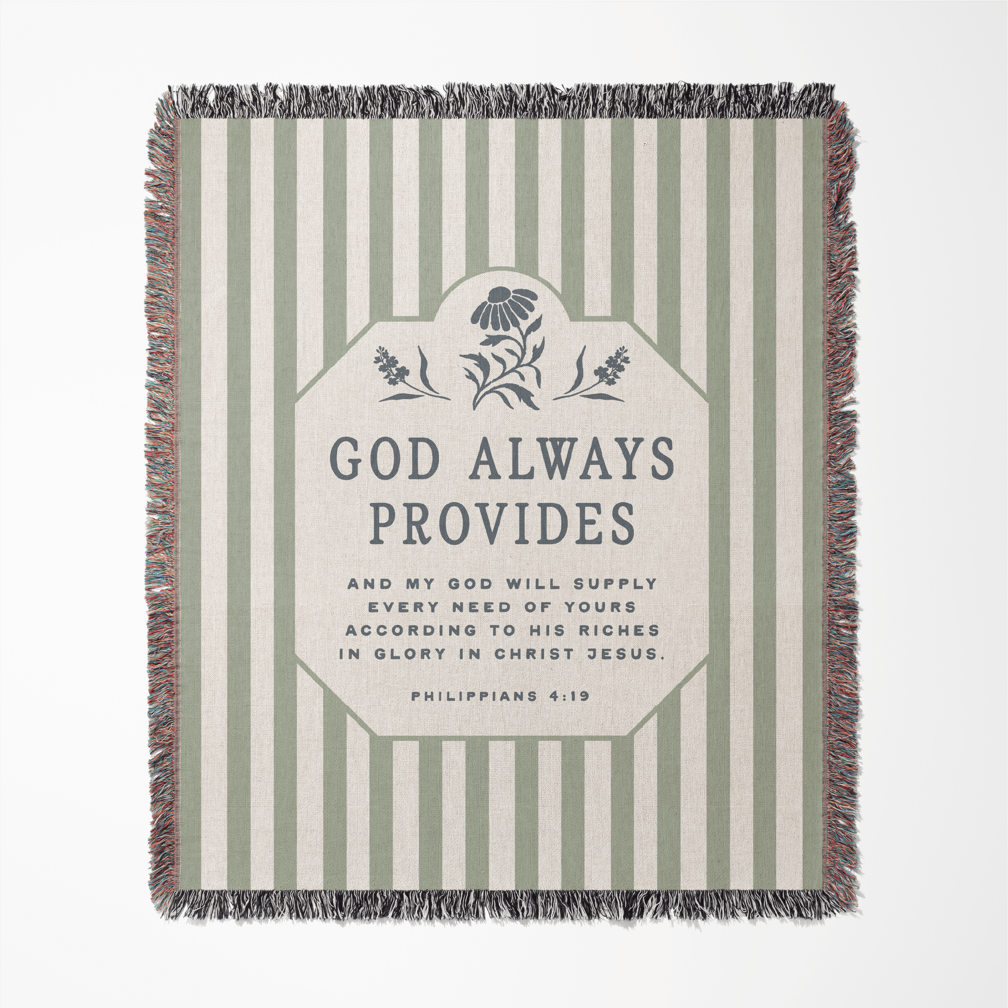 Framed in soft sage stripes with a refined heritage-style frame, this Christian blanket blends timeless design with enduring biblical truth. The centered message, “God Always Provides,” stands as a daily declaration of trust — reminding the heart that God sees every need and faithfully provides according to His perfect wisdom.