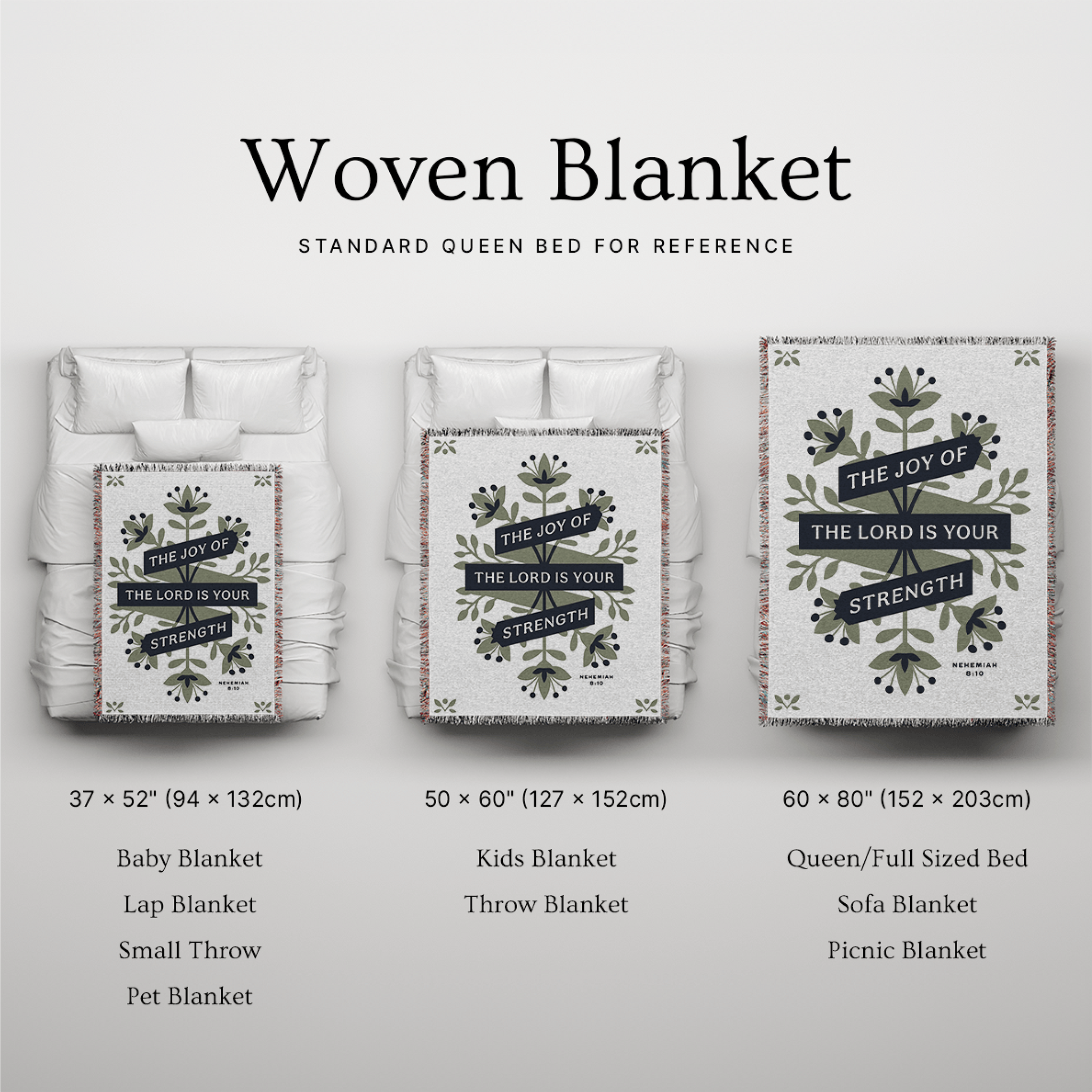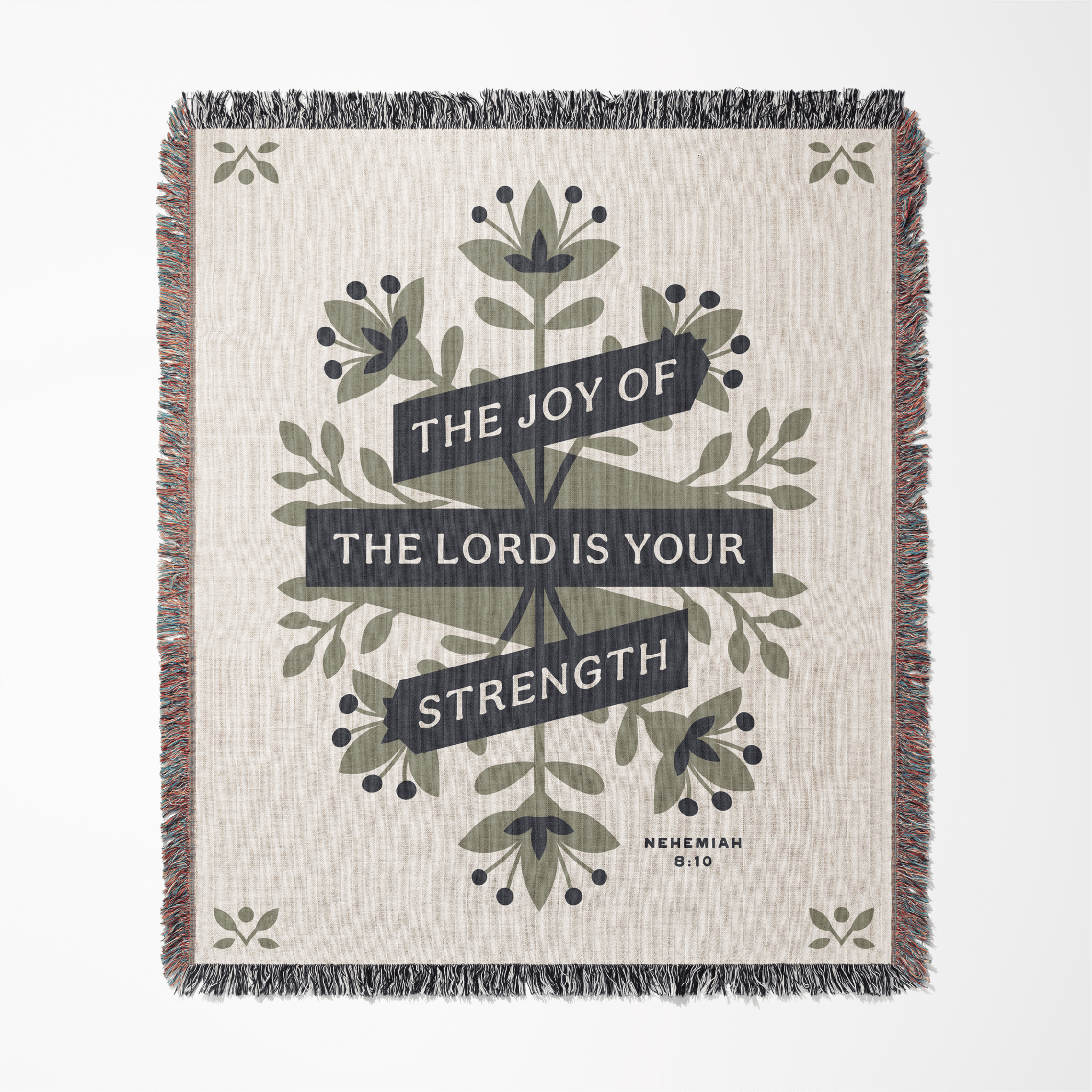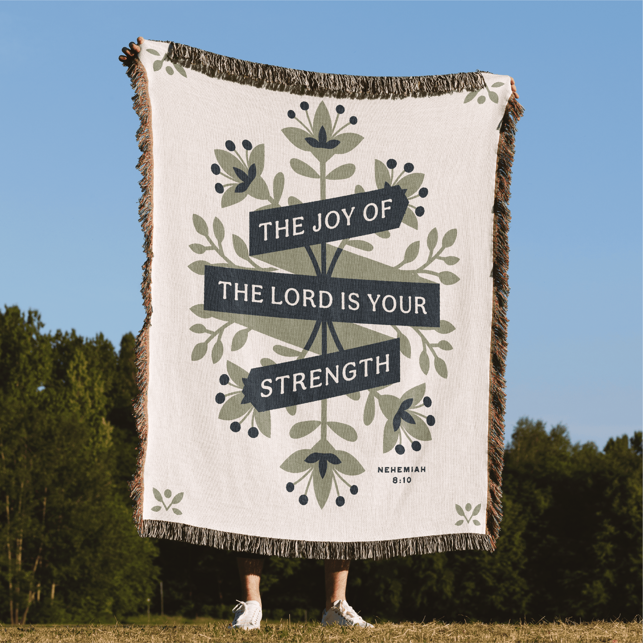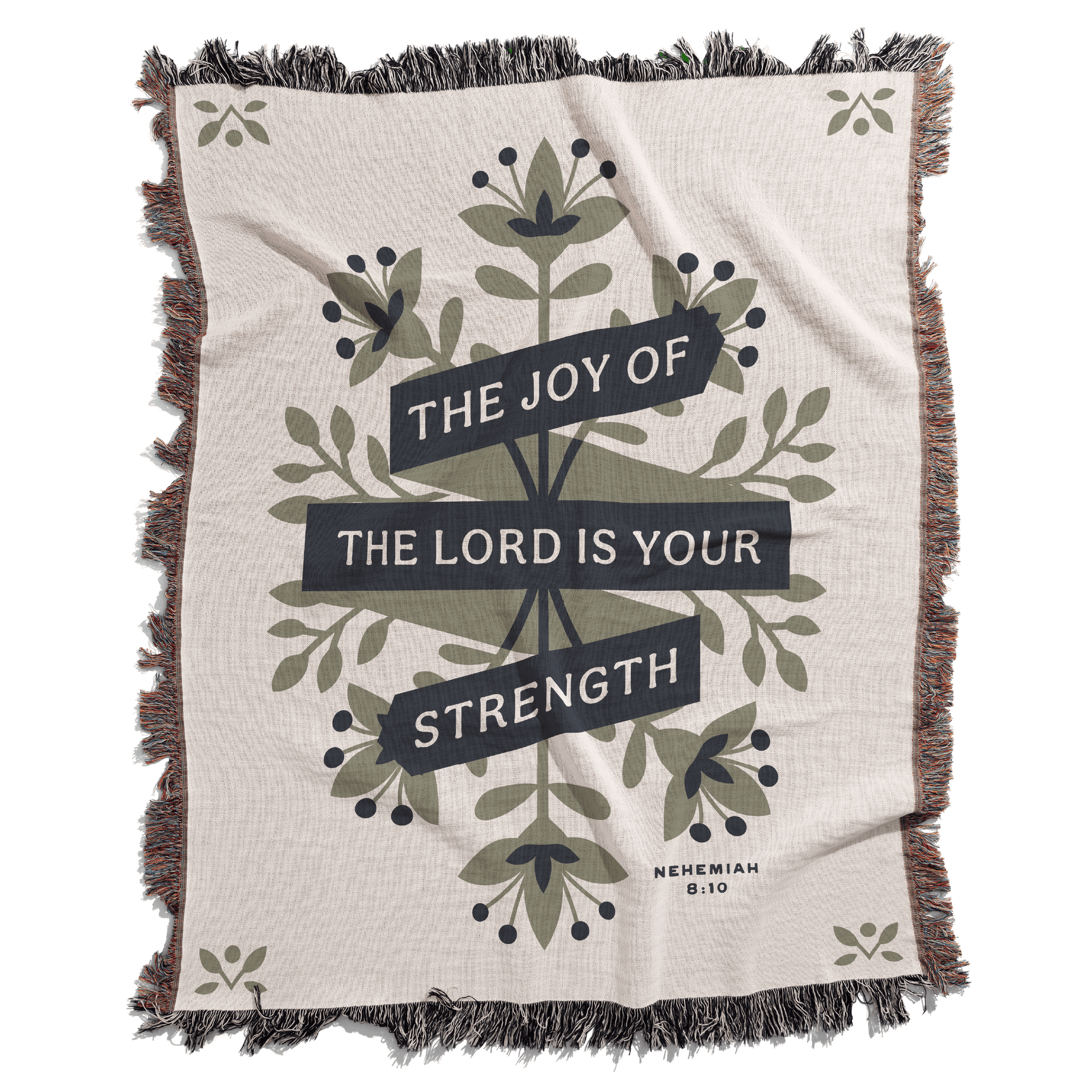 This Midnight Edition of The Joy of the Lord Is Your Strength woven blanket features rich navy and muted olive hues, creating a grounded, heritage-inspired look that feels strong, calm, and enduring.